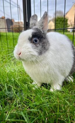 Nous avons tenté plusieurs cohabitation avec des lapines du refuge mais il reste sur la défensive et n'accepte pour le moment pas ses congénère par peur a cause de son passé. En ce qui concerne les humains il a besoin d'un peu de temps pour se sentir en confiance mais une fois en sécurité il demande beaucoup d'attention.